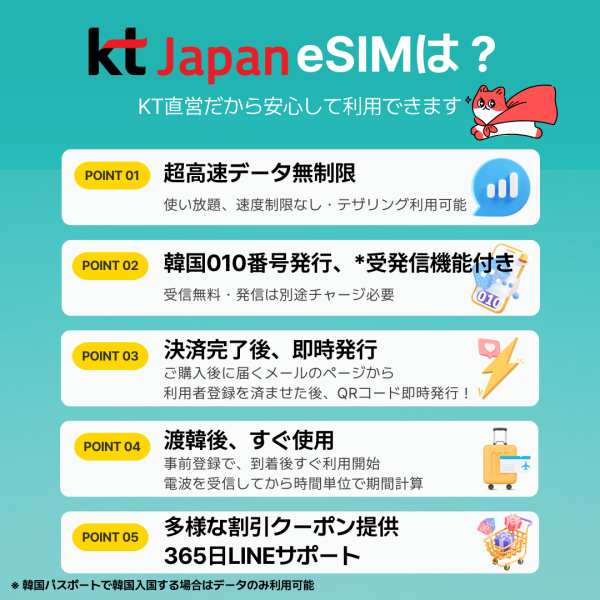 韓国旅行に最適!無制限データ・010番号付きKT公式eSIM・USIMで安心快適なインターネット