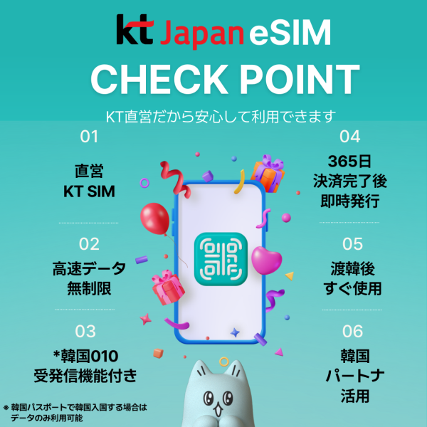 2025年11月~2026年1月 KT Japan SIM 購入認証レビューキャンペーン韓国旅行に必須のKT韓国SIMカードの広告バナーKT Japan eSIMのメリットを示したインフォグラフィック日本の携帯電話サービス「kt Japan eSIM」の特長を紹介する画像PCUe_Plan_90days.pngeSIM対応機種の確認方法と対応機種一覧を説明する画像eSIMの利用開始方法と受取方法を説明する画像利用者登録の認証方法(番号認証と入国認証)を説明する画像eSIM購入前に確認すべき注意事項と利用規約を説明する画像 eSIMに関するよくある質問(FAQ)と回答をまとめた画像 eSIMの事前設定、エラー、アプリ利用に関するFAQの画像 LINEサポートに関する情報と利用終了後の対処法を示す画像 KT Japan会員限定の韓国ホテルと交通割引特典,イニスフリー、ロッテ免税店、新羅免税店KT Japan会員限定の韓国ホテルと交通割引特典,韓服レンタル、エバーランド、カリビアンベイ、ホテルKT Japan会員限定の韓国ホテルと交通割引特典,交通、エステ、グルメ