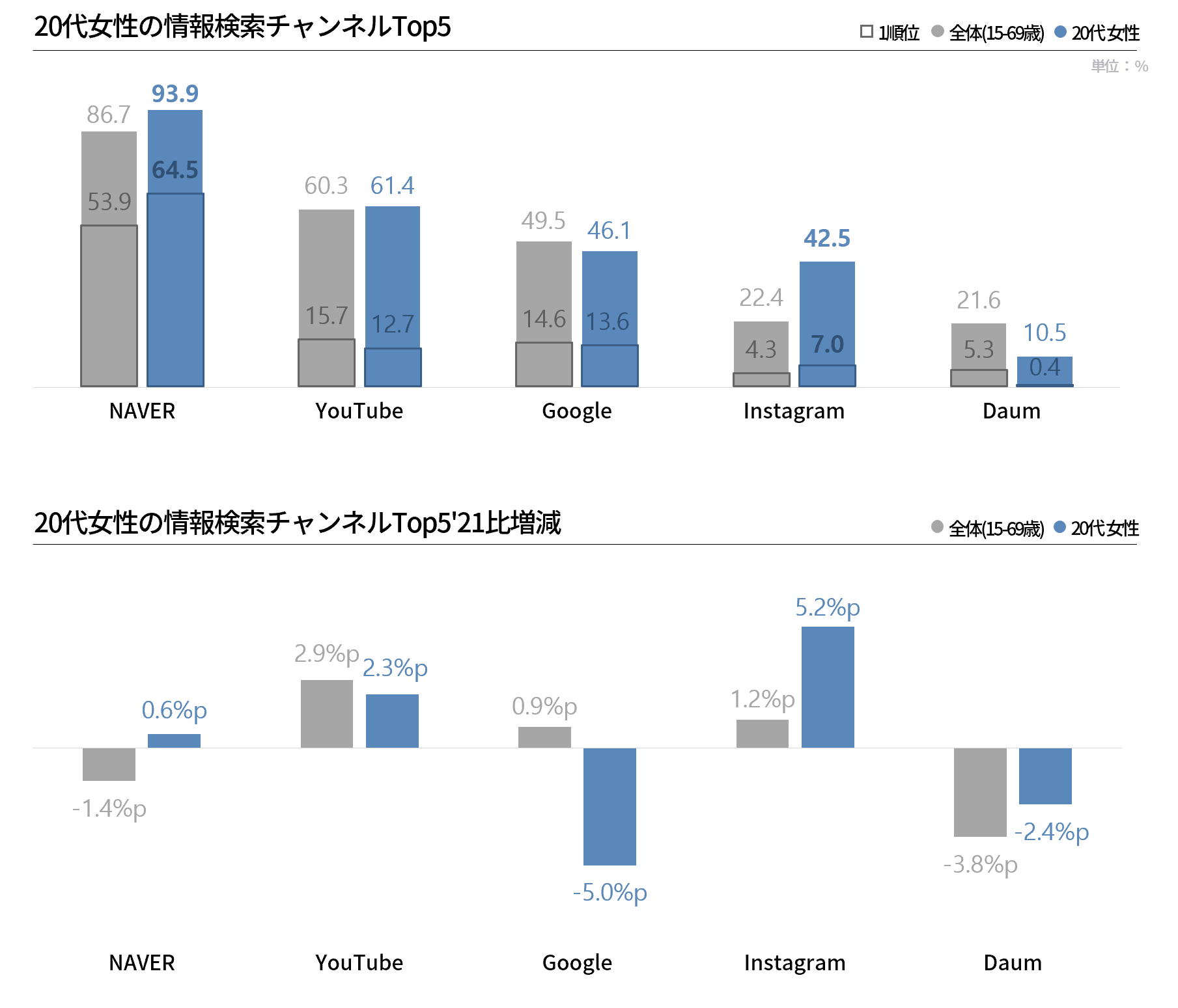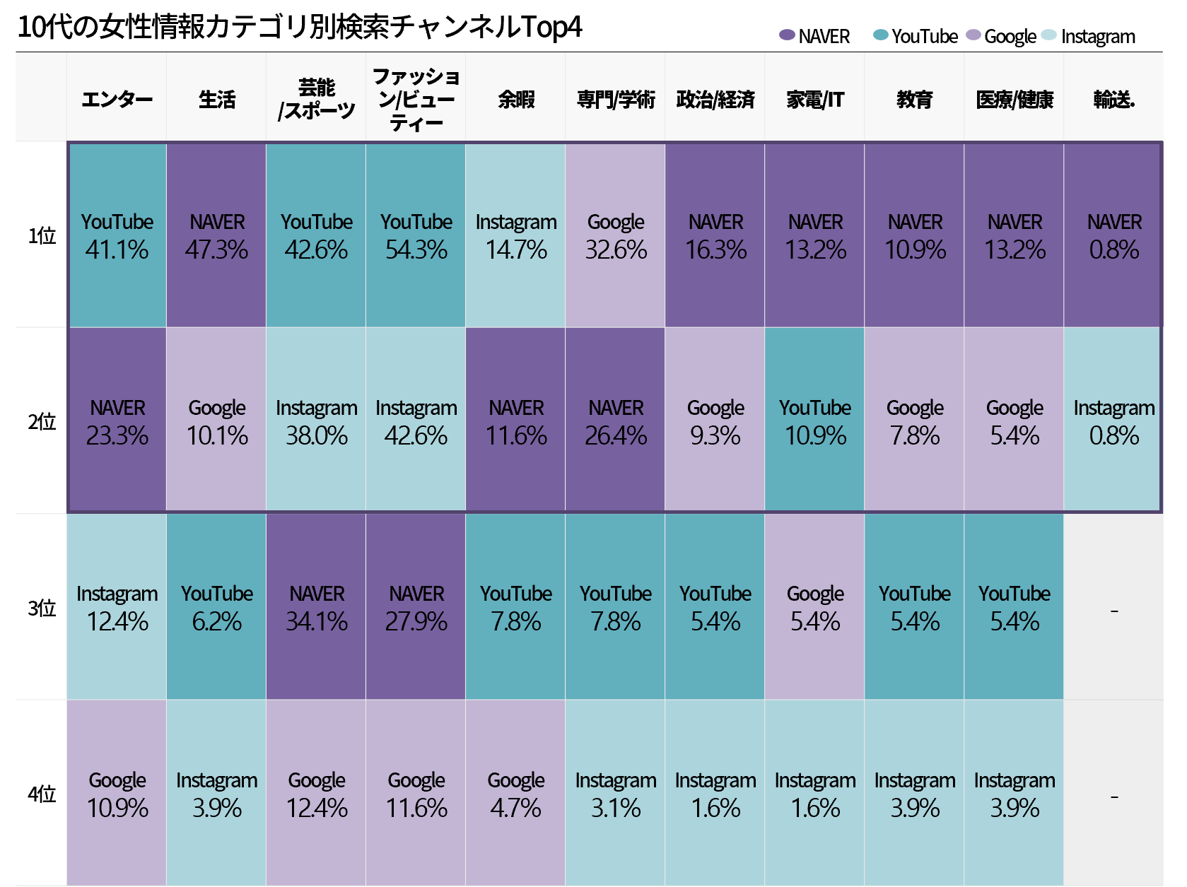 韓国10代女性「NAVERとYouTubeが 中心情報チャンネルで、 Instagramも 着実に上昇中」