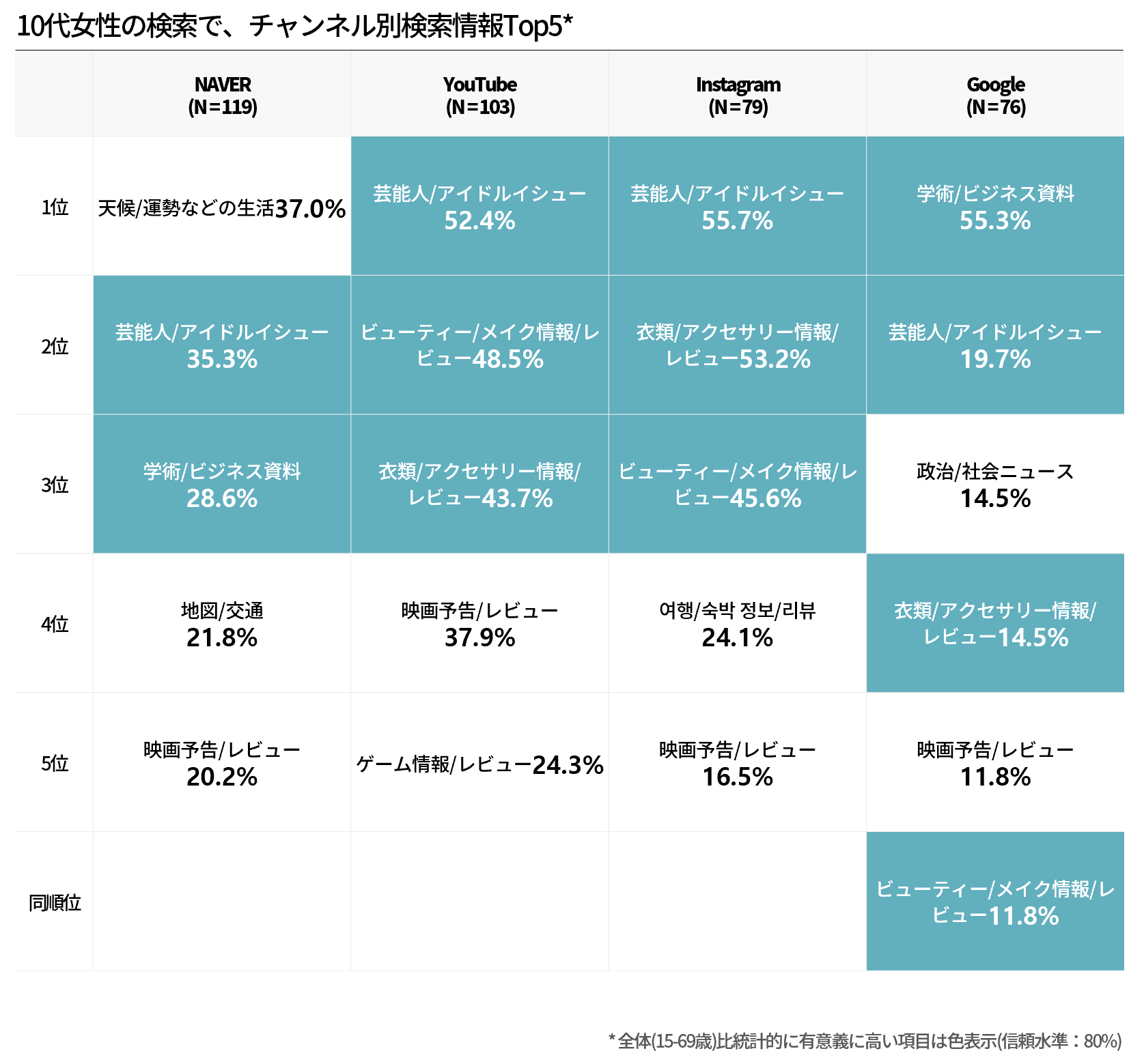 10代女性が情報検索に利用する第1位サービスはNAVER、次にYouTubeを多く活用する。