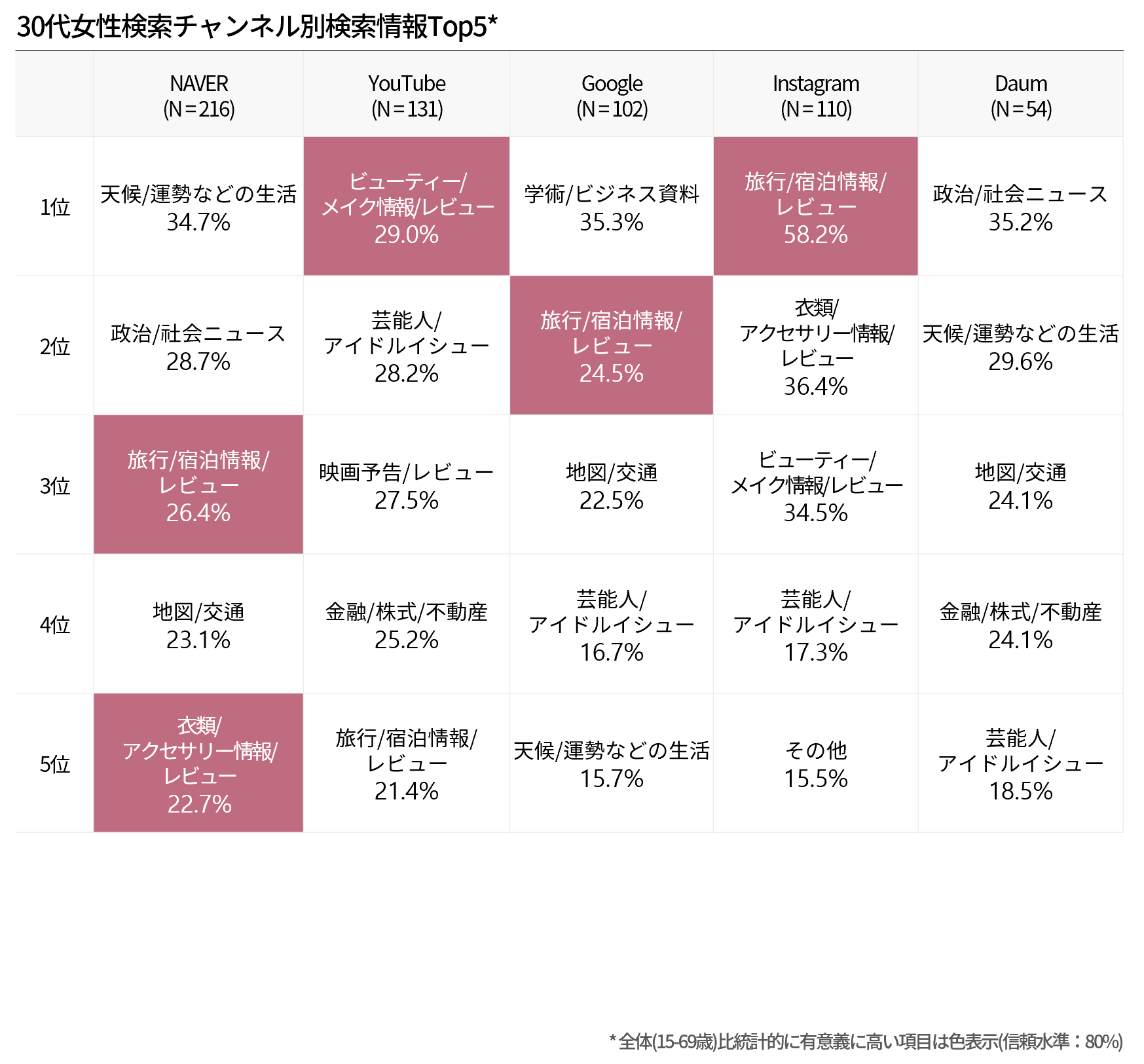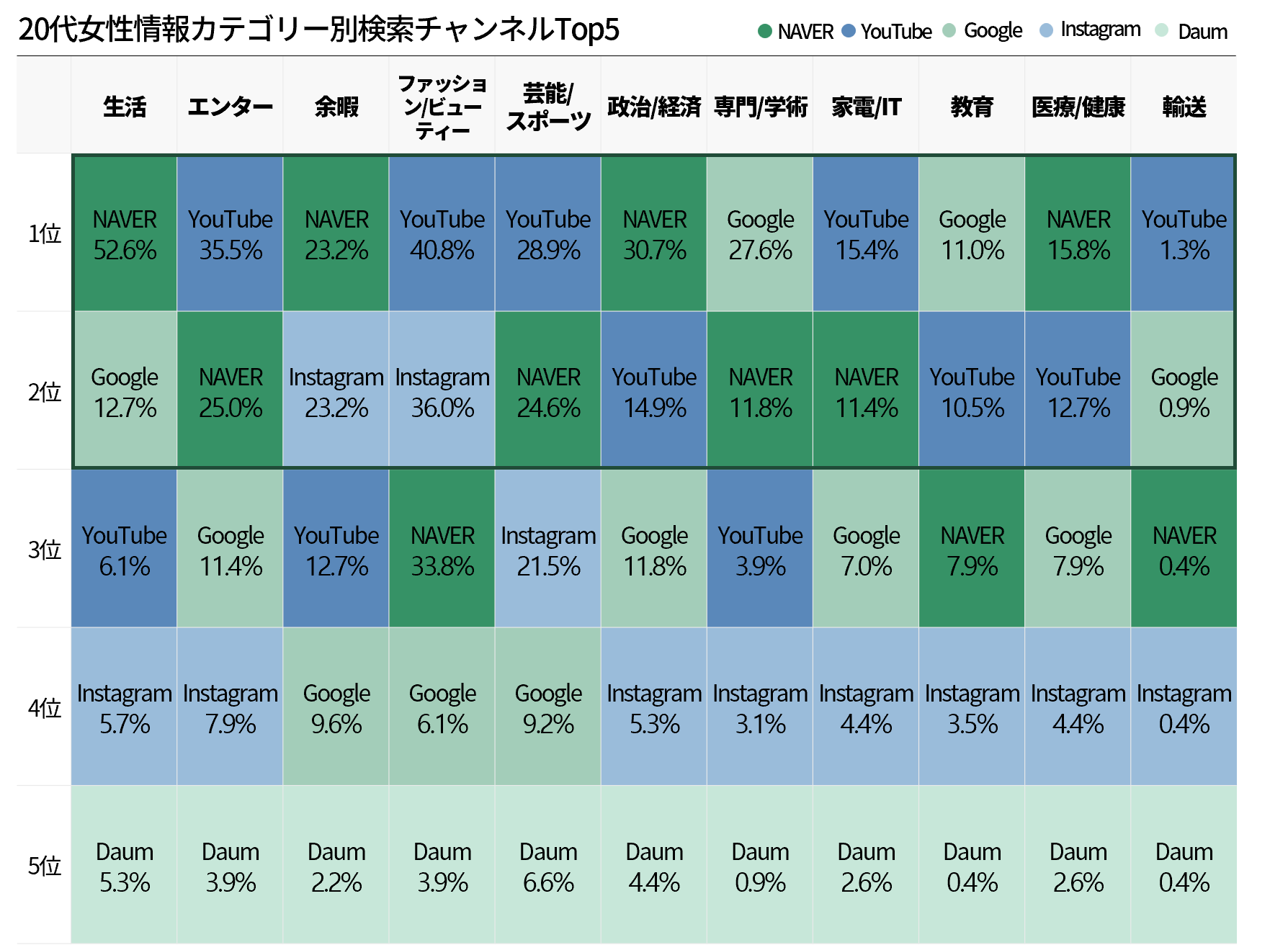 20代は、主な情報チャンネルとしてNAVERとYouTubeを利用し、情報の種類によってGoogleとInstagramを活用する。
