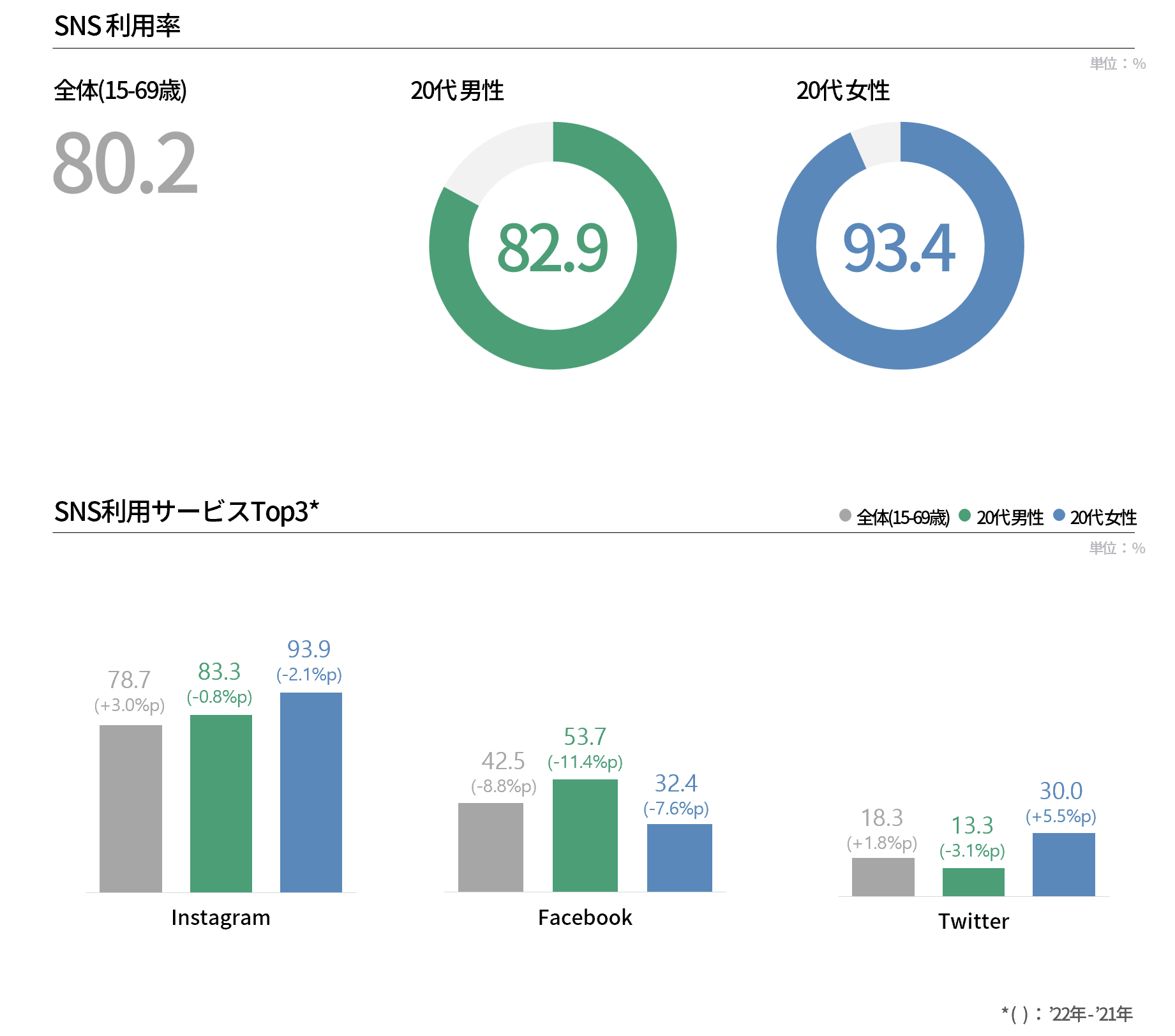 20代はSNS利用率が男性82.9%、女性93.4%で SNSの積極的利用者である。