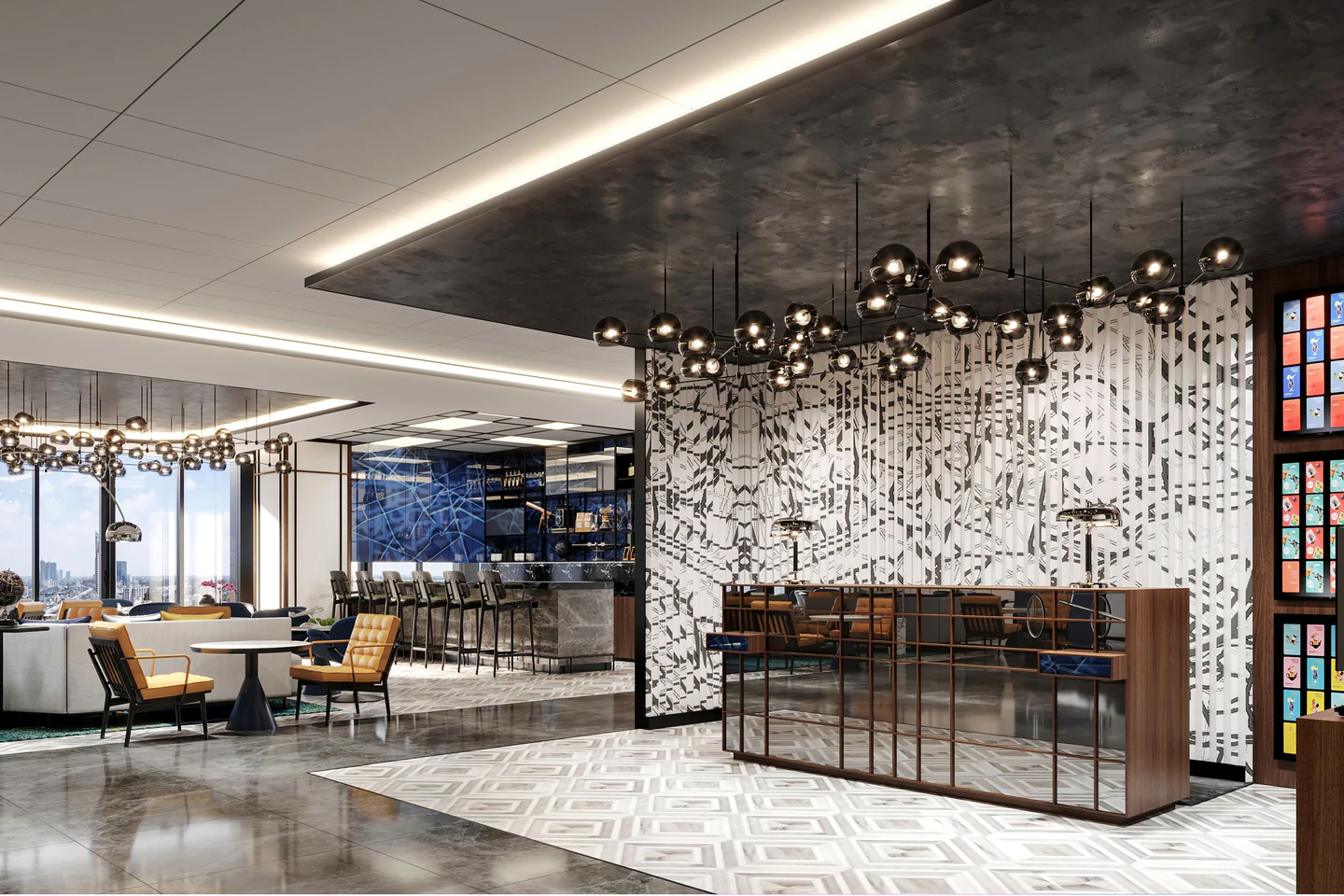 4階に位置するホテルロビーに到着すると、空港のチェックインカウンターのようなレセプションデスク、そして飛行機をモチーフにした壁飾りから旅行とヨーロッパスタイルの装飾からインスピレーションを受けたホテルのデザインコンセプトを感じることができる。 天井に点が押されている造形的なモバイルペンダント照明は、光の都市パリと明るい都市明洞を同時に象徴する。
