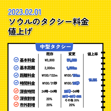 2月1日からソウルタクシーの基本料金が4800円ウォンになり、距離料金も高くなる